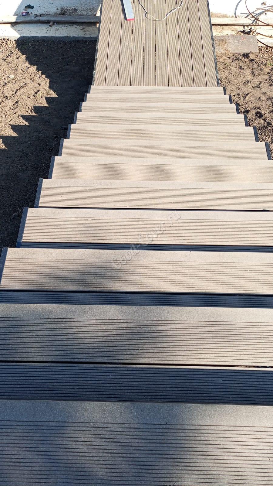 Укладка террасной доски и ступеней из ДПК Good Cover на веранде с лестницей